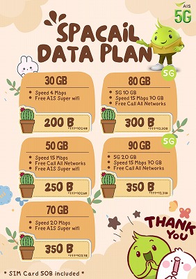 このプランの中には有効期間が書いてないので、たぶんすべて一か月のプランではないかと思います。左真ん中の50GB、250バーツを薦められました。50GBもいらないと思いましたが、30GBの方は通話プランが入ってなくスピードも遅いです。