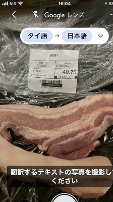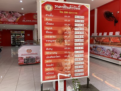 豚三枚肉 1キロ当たり185バーツ(750円)です。         買ったのは 220g 40.75B 170円くらい
